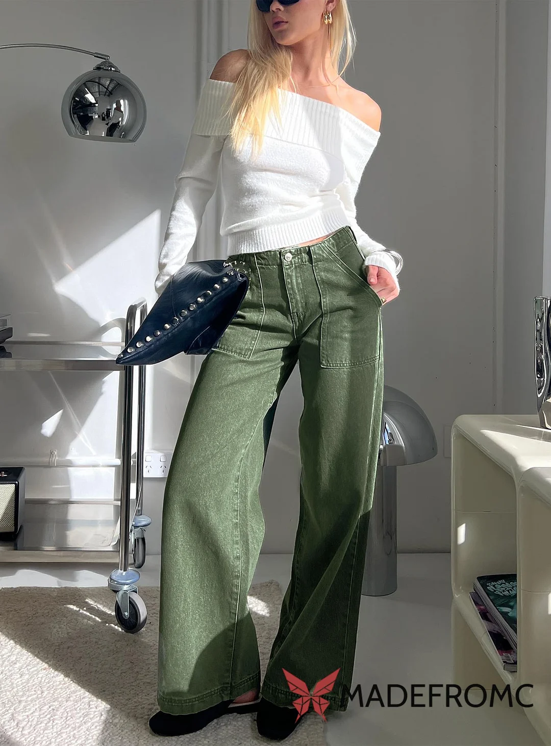 Melikah Mid Rise Baggy Cargo Jeans Green Wash