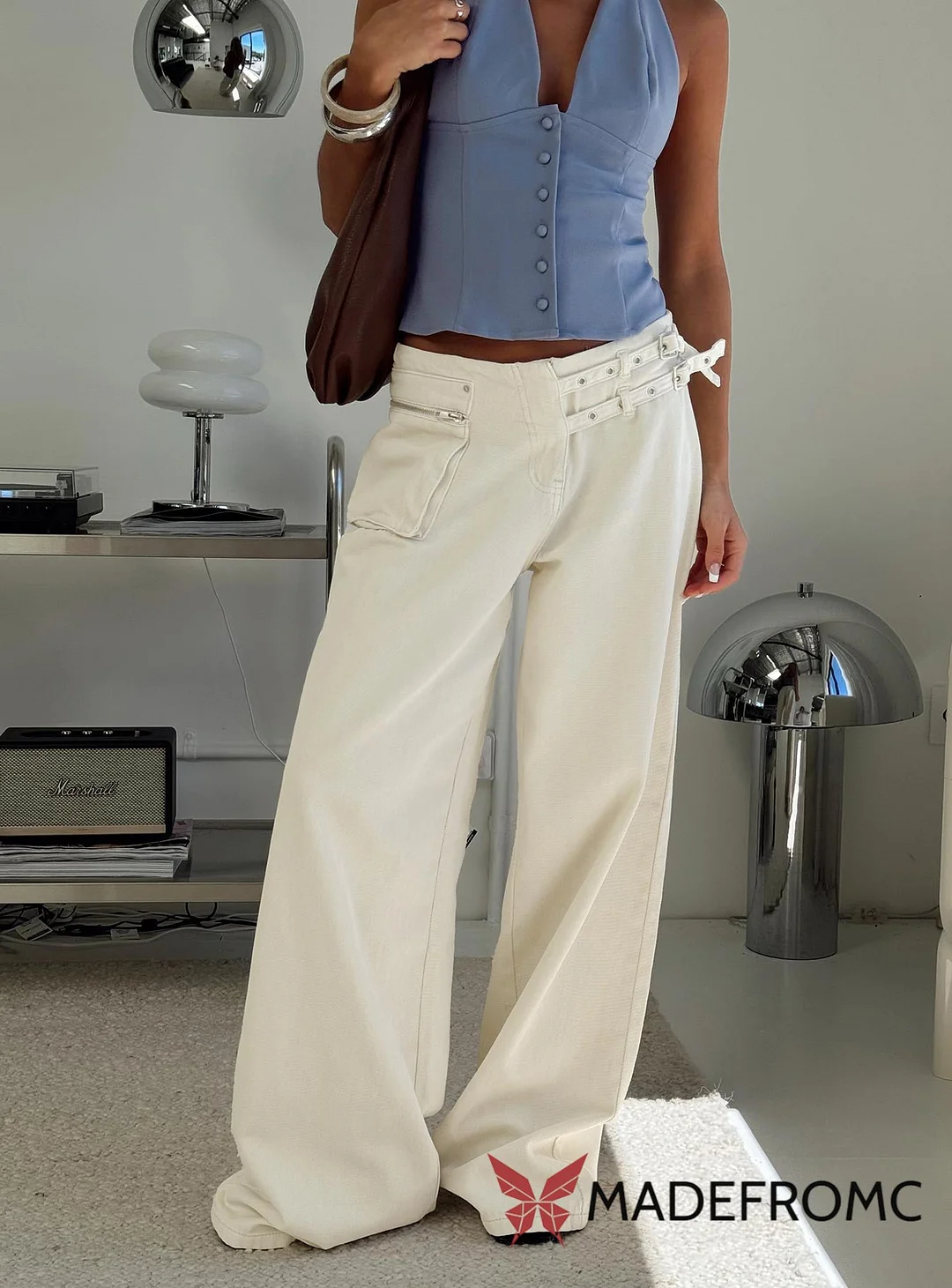 adjustable buckle waist, silver-toned hardware, wide-leg